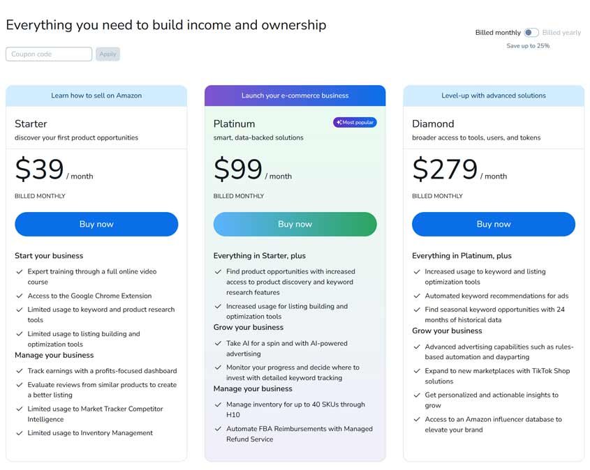 • Starter: This plan costs $39 per month and is a great choice for those new to selling on Amazon. With this plan, users can access most of the essential tools and features of Helium 10, though there may be some limitations. The Starter Plan is an effective way for beginners to speed up and simplify the growth of their Amazon business.